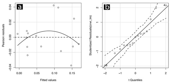 To verify that the CRWI-net GWC prediction function has limited bias based introduced by the clustering of ground truth GWC samples, e.g., [39], we analyzed the linear model shown in Figure 10 using the carData package in R [40] (Figure 14) to determine if systematic variation exists in the residuals of the linear model relating CRWI to net GWC. Pearson residuals are small (typically < ±0.04) and are not structured: the model does not appear to be under- or over-fitting the data, and there is no evidence of non-constant variance (i.e., systematic changes across the measurement domain). Quantile-quantile (QQ-plot) analysis (Figure 14) shows no major departures from normality: the standardized residuals of the CRWI-net GWC linear model lie on a straight line.