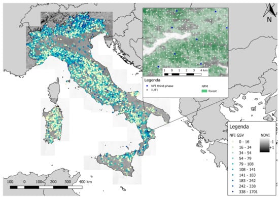 Figure 1. The study area with the distribution of the national forest inventory (NFI) plots colored by growing stock volume (GSV) expressed in m3 ha−1. On the right, a detail of the distribution of sample points used in the study within the NFI 1 x 1 km grid where the third-phase NFI plots (Section 2.2.1) are depicted in blue and the Inventario dell’Uso delle Terre in Italia (IUTI) points (Section 2.2.2) in white.