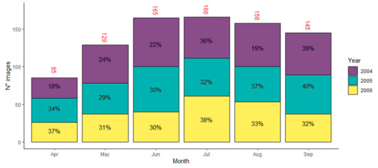 Figure 2. Distribution of Landsat 7 ETM+ images per month, divided by acquisition years.