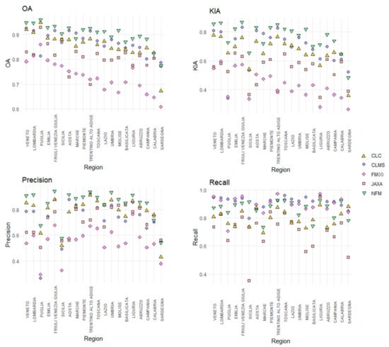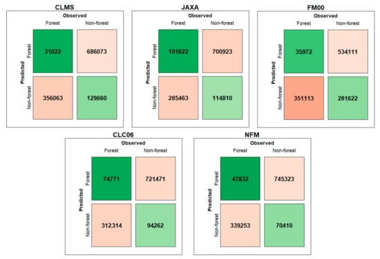 These metrics need to be used together to correctly describe the quality of classification in the case of unbalanced datasets. This is the case for forest masks when the forest and non-forest classes cover the land area with very different proportions. In such cases, many classification performance indicators including overall accuracy may provide misleading information [74,75]. For this reason, the mask accuracy comparison should focus on recall as per Equation (6) and, most importantly, precision as per Equation (5).