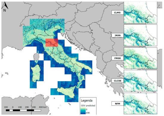 where n is the number of third-phase NFI plots (i.e., 6782), y i is the i-th GSV associated with the plots and y i ^ is the i-th GSV predicted by the random forests model. The most accurate combination resulting from LOOCV was used to predict the GSV for all N pixels of the study area to produce a 23 × 23 m resolution GSV map. The model fitting and optimization phase was performed using the randomForest package within the statistical software package R 3.6.3 [73] (https://www.r-project.org, accessed on: 5 November 2020). For the 6782 NFI plots, the pixel-level GSV predictions ranged between 0 and 690 m3 ha−1 with a standard deviation of 68.5 m3 ha−1 while the original NFI values ranged between 0.3 and 701 m3 ha−1 with a standard deviation of 147 m3 ha−1. The map was found to have a mean deviation of −4.3 m3 ha−1.