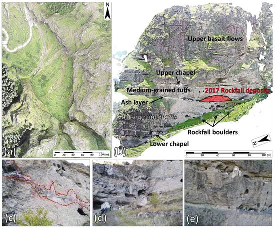 Vanis Kvabebi geological-geomorphological features: true color UAV-DP photogrammetric digital models: nadiral view (a); frontal view of the eastern main cliff of the monastery showing the outcropping lithologies of the Godertzi formation and the 2017 rock fall deposits (b); welded tuffs (dashed red line) (c); lower chapel with ancient rockfall boulder (d); upper chapel (e).