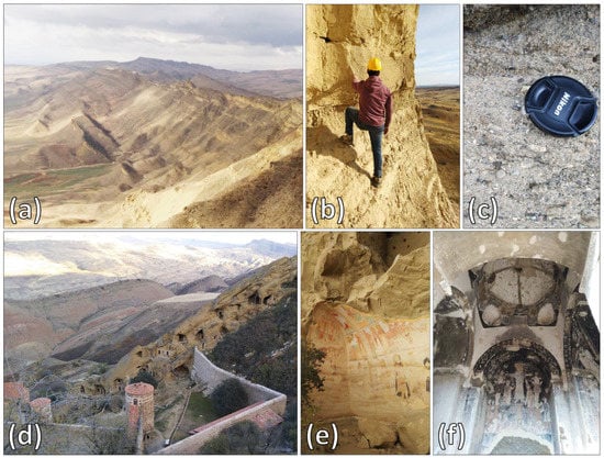 - Okrostsvaridze, A.; Chung, S.L.; Lin, Y.C.; Skhirtladze, I. Geology and zircon U-Pb geochronology of the Mtkvari pyroclastic flow and evaluation of destructive processes affecting Vardzia rock-cut city, Georgia. Quat. Int. 2020, 540, 137–145. [Google Scholar] [CrossRef]