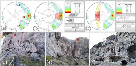 Structural setting and kinematic analysis at Vanis Kvabebi: identified sets (a); kinematic analysis for planar (b) and wedge (c) failures; 2017 rock fall deposits (d); subvertical fracture where creek channel erosion has concentrated (e); welded tuff portion affected by wedge failures (f).
