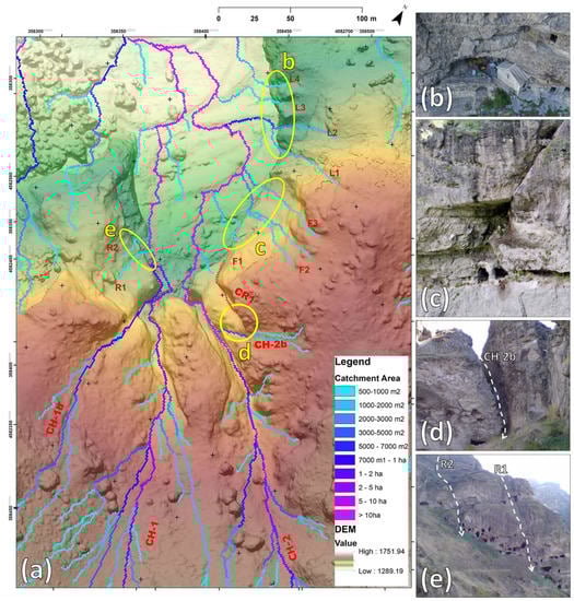 Vanis Kvabebi surface water run off model: (a) 14 cm resolution DSM with streams categorized by catchment area (ovals highlight details in b-e; stream legend: L = left cliff; F = front cliff; R = right cliff; CH = channels); (b) top-view of the lower chapel area; (c) Large niche created by erosional features of the J2 set Master Joint; (d) erosional channel in correspondence of J3 fracture; (e) stream gullies on the slope of the ravine opposite the monastery.