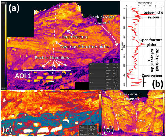 Vanis Kvabebi IRT data: mosaicked surface temperature map of the main sector of the eastern cliff (a) (the white rectangle represents the Area of Interest 1 = AOI 1 shown in (c)); vertical surface temperature profile of the cliff (b) (Li1 in a); detail of the 2017 collapse sector (AOI 1) (c); surface temperature map of the cliff’s southern sector (d).