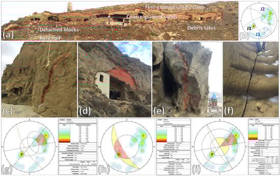 Hereafter the outcomes of the surveys on the sites of Natlismcemeni and Sabereebi are presented. Like many of the monasteries of David Gareja, the Natlismcemeni complex (still inhabited by a monastic community) is located on top of a hogback ridge overlooking a low hilly landscape and is mainly carved in a 40 m high rock cliff. The latter is formed by a 20 m-thick sequence of thin alternating layers of fine-grained sands and clays capping a 20 m-thick level of coarse-sand layers; a debris talus discontinuously mantled by sparse bushy vegetation covers the lowermost part of the sequence (Figure 10a). The monastery’s main spaces (chapels and monks’ cells) are represented by three levels of over 30 caves cut into the thick weak sandy layer, while additional brick construction works are placed either on top of the sequence (tower) or adjacent to the cliff face (a new chapel and storage rooms; Figure 10a). The main discontinuities are organized in two main joint sets: J1 is related to the bedding and dips NE against the slope with low angles; J2 is a mainly subvertical set dipping SW along the slope; J3 is a subvertical fracture sparsely cutting the cliff face (Figure 10b). These fractures have a fundamental control on the stability of the cliff, as testified by detached large blocks deposited at the foot of the cliff on the northern sector of the cliff face (Figure 10a). The performed 2D kinematic analysis allowed for assessing the main instability mechanisms affecting the rock cliff, which are represented by plane failure, followed by wedge failure and subordinately by toppling (Figure 10c–g).