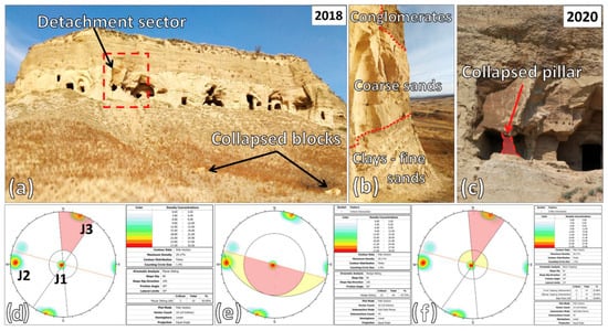 The monastery of Sabereebi (currently abandoned) is composed of a series of 15 frescoed caves (Figure 12a) developed on three levels carved in sandy layers. As for Natlismcemeni, Sabereebi is located on top of a hogback ridge carved in material formed by a transition between very weak sandstones and partially cemented sediments, represented by a sequence of conglomerates at the top, a 10 m-thick level of coarse-grained sands overlying a sequence of alternating fine-grained sands and clays; a sparsely vegetated debris talus covers the slope toe (Figure 12a,b). In fact, some sandy blocks were found at the foot of the talus during the 2018 field survey, one of them evidently freshly detached from a pillar formed by the intersection of J2-J3 (Figure 12a,c,d). The bedding (J1) dips NE towards the slope with low angles, while two not widely spaced but persistent discontinuity sets cut the slope parallel (J2) and orthogonal (J3) to the cliff face, dipping E and SSW respectively, deeply affecting the stability of the cliff (Figure 12e). The 2D kinematic analysis confirms high planar and especially wedge failure indexes along these planes, subordinately toppling (Figure 12c–f).