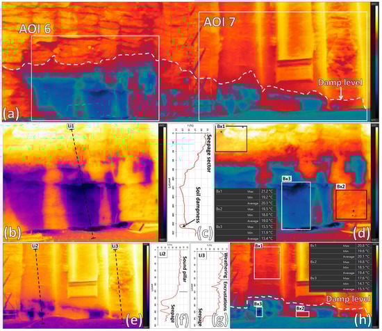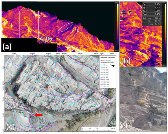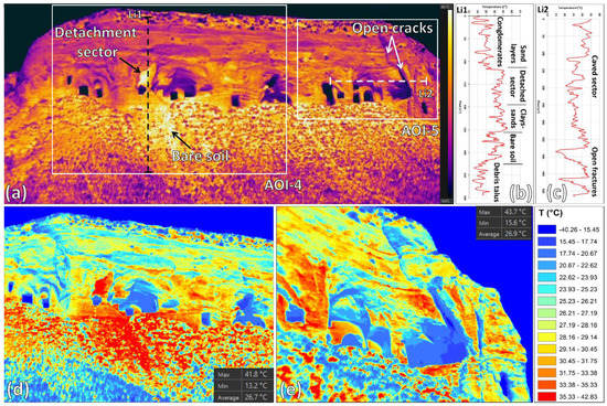 The IRT surveys were carried out from a 100 m distance, leading to a 1120 × 1460-pixel image with 6.5 cm pixel size. Several thermograms were mosaicked creating a surface temperature map of the main part of the eastern cliff face (Figure 8a). A temperature gradient is visible from top to bottom (Figure 8b): the upper basalt flow portions show higher temperatures (3.4 °C), due to a more direct sunlight radiation with respect to the lower medium-grained tuff level (2.4 °C), and especially the coarse-grained tuffs, more shaded and cooler (1.9 °C), also due to the presence of grass cover at bottom of the ravine. Warm anomalies were highlighted in correspondence to the ledge-niche systems in the upper basalts and the cave system (4.4–6.5 °C), the eroded lower part of the basalt flows (4.2–5.6 °C), and along which the second level pathway develops but especially where the master joint belonging to J2 intersects the whole lower basalt portion. Regarding this open fracture (over 40 m persistent) the IRT data allowed for the description of the aperture geomechanical parameter as from extremely wide (10–100 cm) to cavernous (>100 cm) according to []. In correspondence to the 2017 rock fall niche (AOI 1 in Figure 8c), no evidence of moisture/seepage phenomena was detected; therefore, dry conditions were assessed during the survey (Figure 8a,c).