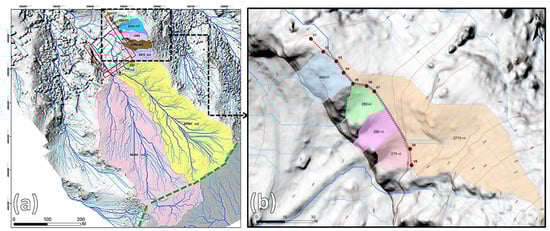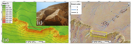 The field surveys highlighted differential erosion as an important local predisposing factor of instabilities, creating large niches along the bedding, especially in correspondence of the softer and more erodible ash layer and the upper section of the medium-grained tuffs, therefore undermining the overlying overhanging cliff sectors. In this framework the main identified high angle joint sets (Figure 6a), combined with the stratigraphic features worsened the cliff instability: J1, dipping W parallel to the cliff face determines planar failures (Figure 6b,d) especially affecting the overhanging sectors within the tuff layers, while the combination of J2 (dipping NE) and J3 (dipping SW) cause wedge failures (Figure 6c), occurring especially in correspondence of the more competent welded tuff sectors (Figure 6f). The 2D-orthoprojection and the performed hydromodelling allowed the investigation of the complex drainage pattern of the ravine, with streams categorized by catchment area and order (Figure 7a). Very low order rivulets develop on the main cliff (eastern sector) along the J3 fractures (Figure 7a–c), as well as the main streams located in the southern sectors, which deeply cut into the volcanic sequence along large erosion channels involving the whole cliff height (Figure 6e and Figure 7a). In particular, stream erosion acts along the J3 master joint creating potentially unstable niches at the base of the medium-grained tuffs (Figure 7d).