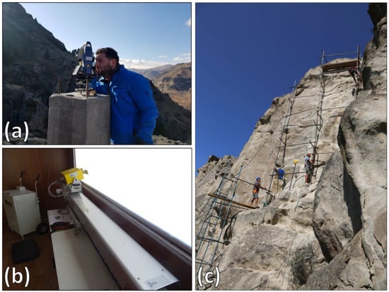 Considered as one of the oldest urban settlements in Georgia and an important political, cultural, and religious center, it flourished during Hellenistic and Roman times, while its decline started in the 4th century. It then acted as a stronghold during the Muslim conquest in the 8th–10th centuries, while the Mongol raids in the 14th century marked the ultimate eclipse of the town, after which the town was abandoned. It consists of a defensive wall, a ditch, streets, tunnels, water pipes, and drainage channels carved in rock. At the summit of the complex a Christian church was built in the 6th century (Figure 4a,b). The current morphology of the site is the result of active tectonics (several parts of the most vulnerable areas were destroyed by an earthquake in 1920), weathering and erosion due to water infiltration and runoff (also caused by the Kura river action), and wind erosion. In this context ancient rockfall deposits at the slope-toe show that slope instability phenomena have contributed to the shaping of the cliff (recent minor rockfalls were reported from June 2018 to October 2019). This led NACHPG to start a conservation program in 2000 [], while in 2007 the whole complex was enlisted in the tentative list for inclusion into the UNESCO World Heritage program [].
