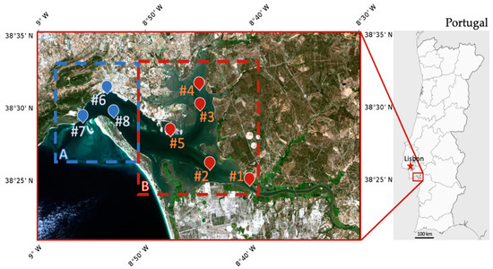 Location of the Sado estuary in the Portuguese territory and of the 8 sampling stations within the estuary. (A) (blue box) and (B) (red box) are the outermost and innermost areas of the estuary, respectively.