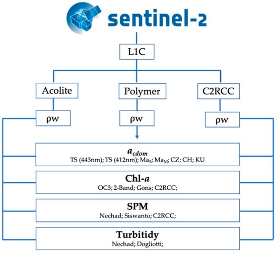 Processing chain applied to Sentinel-2 imagery for water quality parameters retrieval. ρw refers to the water-leaving reflectance obtained from the different AC processors: Acolite, Polymer, and AC-C2RCC.