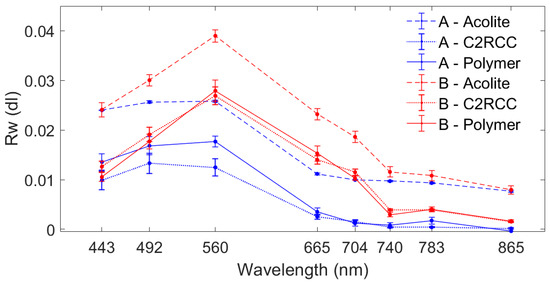 Sentinel-2 derived spectra for the different processors under investigation (Polymer: solid, C2RCC: dotted and ACOLITE: dashed lines). Mean and standard deviation (bars) of the match-ups available for all the processors at stations in the outer (A) and inner basin (B) are shown with blue and red lines, respectively.