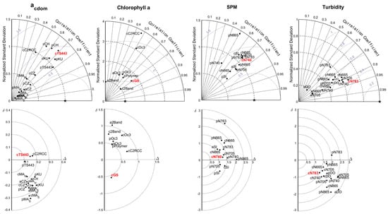 Taylor diagrams (top) and Target plots (bottom) showing the performances of the different combinations of AC processors and bio-optical algorithms respect to in situ observations. For CDOM, SPM, and turbidity, only algorithms that presented APD < 100% were considered. For the names reference, the first letter refers to the AC processor (a (Acolite), p (polymer), c (C2RCC)) followed by the bio-optical algorithm and band involved.