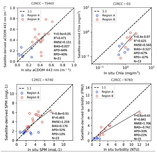 Match-ups of the best performing AC plus bio-optical algorithm of the four WQ parameters under investigation. Statistics shown correspond to regions A and B together, but they are identified with different colors. The full statistics of the match-ups results are presented in Table 4. (Please note the different scales).