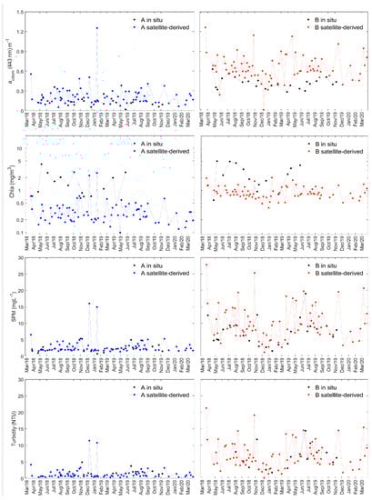Figure 7 and Figure 8 show the time-series of the different parameters considering the spatially averaged observations. From a visual inspection, it is hard to observe a clear seasonal variability of any of the selected parameters in area A. Moreover, region B presents a greater amplitude (over a short time, due to tidal variability) of values in respect to region A, which remains relatively constant. This might lead to bigger uncertainties associated with satellite-derived products over region B due to higher optical variability and greater interaction between the optically active compounds. Therefore, a worse performance of the bio-optical algorithms is expected. Moreover, the greater amplitude of values will lead to difficulties in detecting WQ anomalies without a consistent climatological record of the area of interest. On the other hand, S2-MSI time-series may allow us to better understand the short-term variability which would be highly laborious through in situ observation.