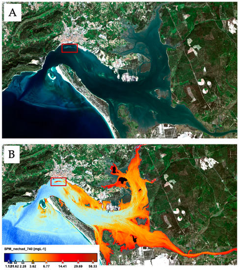 (A) S2A RGB image and (B) SPM map of the Sado estuary acquired on 19 February 2020. Inside the red box, the sediment plume produced by the dredging activities is clearly visible. The SPM map (B) was produced through the best performing processing chain selected for SPM retrieval (AC-C2RCC in combination with Nechad algorithm at 740 nm). Please note that no bottom reflection correction was implemented.