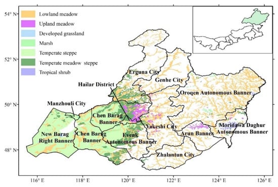 Administrative divisions and grassland classification in Hulun Buir. In this figure, county boundaries were used to divide the different districts. The name of each administrative district is given in bold. The blank areas represent non-grassland areas. The grassland classification dataset is based on a 1:1,000,000 Vegetation Atlas of China [49].