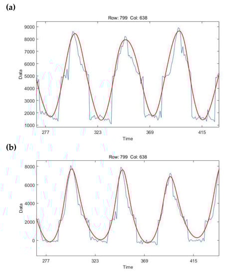 We downloaded Moderate Resolution Imaging Spectroradiometer (MODIS) MOD09A1 data (2001–2015) National Aeronautics and Space Administration (NASA) https://modis.gsfc.nasa.gov/ (accessed on 9 February 2021). MOD09A1 provides 8-day surface reflectance of the MODIS Terra product with 500-m resolution of bands 1–7, projected as sinusoidal projection. Each MOD09A1 pixel contains the best possible L2G observations over an 8-day period, taking into account the effects of high viewing coverage, low viewing angles, cloudless and cloudless shadows, and aerosol concentrations. This scientific dataset provides products, including reflectance values for bands 1–7 and quality evaluation data. Data project transformation and subset for analysis were prepared using the MODIS Reprojection Tool and Envi5.3 software. For processing, the time series was filtered with a double logistic function. The function formula used was given below: