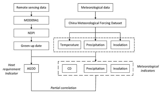 Flow chart of the key indicators computation and statistical analysis is displayed in Figure 5. Green-up date was extracted based on the NDPI calculated from remote sensing data (MOD09A1). Meteorological indicators were calculated from the temperature, precipitation, and insolation according to the green-up date. A partial correlation analysis was used to investigate the relationship between the heat requirement indicator and meteorological indicators.