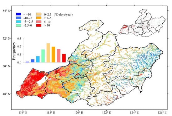 During the study period, 71.3% of the study area showed an increasing trend in AGDD requirement (Figure 10). Pixels showing significant changes in AGDD requirement (p < 0.05) accounted for 9.3% of the entire study area. Of these pixels, 7.8% of the study area showed a significant increase; these were primarily distributed in the temperate steppe area of New Barag Right Banner.