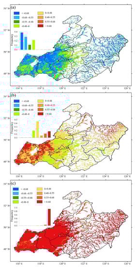 The trend for precipitation (Figure 11b) in 93.6% of the pixels ranged from −3 to 1 mm year–1. Of these pixels, 16.4% showed a significant trend for reduced precipitation (p < 0.05), of which 74% were distributed in the eastern temperate steppe and northeastern lowland meadow.