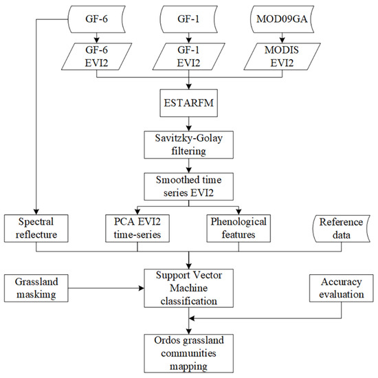 In this study, we attempt to propose a SVM–based method for regional-scale grassland community classification integrating two-band enhanced vegetation index (EVI2) [46] time-series, phenological features and GF multispectral data. The objectives of this study are to: (1) test the applicability of the ESTARFM algorithm in GF-1/6 satellite data; (2) verify whether the addition of phenological features and EVI2 time-series are capable of improving the accuracy of grassland community classification; (3) verify the advantage of GF-1/6 satellite data in grassland community classification; and (4) map the spatial distribution of the five main grassland communities in Ordos at 16 spatial resolution.