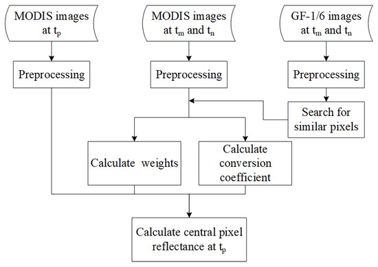 The ESTARFM algorithm was modified from the spatial and temporal adaptive reflectance fusion model (STARFM) [43], and the flowchart of it is shown in Figure 3. It considers the heterogeneity of the pixels, adjusts the assignment method, and introduces a conversion coefficient to improve the fusion results, which improves the fusion accuracy, especially in the regions with considerable heterogeneity [44]. After aligning two images, it is assumed that the difference in reflectance between the GF and MODIS pixels is only caused by the systematic biases. Therefore, the linear relationship between the reflectances of the MODIS and GF data is as shown in Equation (1)