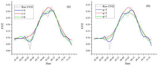 An example showing the smoothing effect of EVI2 time-series under different parameters of S–G filter (one pixel in grassland): (a) q = 2, r = 4, 5, 6 respectively. (b) r = 5, q = 1, 2, 3 respectively.