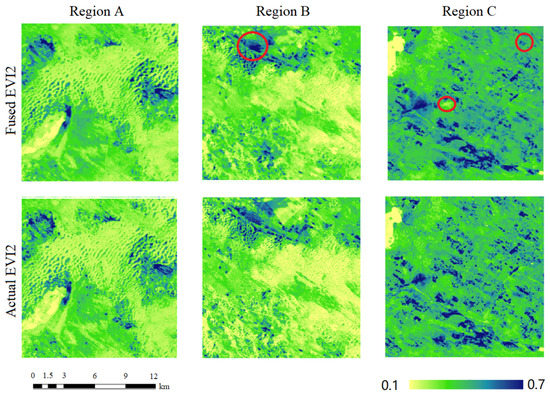 Comparisons of the fused EVI2 data with the corresponding the actual GF EVI2 images.