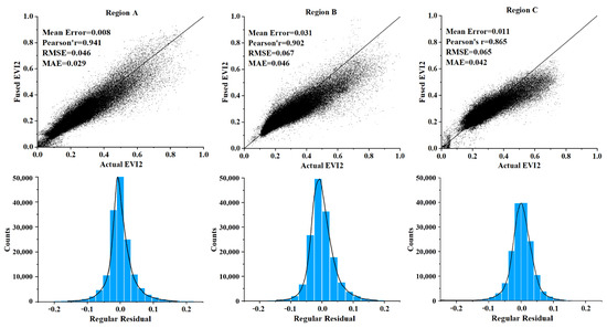 Representative scatter plots between actual EVI2 and fused EVI2, and residuals histogram of Region A, B and C.