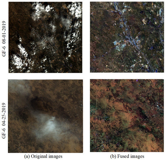 To demonstrate the effect of ESTARFM-based de-clouding, two examples of fusion are shown in Figure 7. According to the results, the clouds in the original images are effectively removed.