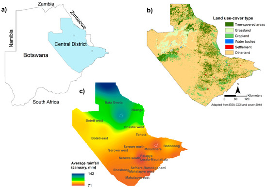Study location: (a) Central District in eastern Botswana; (b) Land use-land cover for 2018; (c) Peak distribution of rainfall in the 17 constituencies examined in the study.