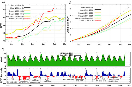 Figure 3a,b compared maximum, mean and cumulative NDVI in the entire time series (2000–2018) with those of the drought years (2002–2003 and 2003–2004) and non-drought year (2009–2012). Vegetation productivity for 2020–2021 as the ongoing growing season is also depicted. Vegetation productivity during the 2009–2010 non-drought growing season was higher than the mean of the entire time series for most months, except in mid-February to March, whereas, for this current growing season (2020–2021), vegetation productivity is well above the mean of the entire time series from mid-October 2020 to February 2021. NDVI anomalies (Figure 3c) captured lower or higher than normal vegetation productivity in the time series. There were some extended periods of very low vegetation productivity over multiple growing seasons. Examples are the period from the middle of the 2002–2004 growing seasons and 2004–2005 to the start of 2005–2006 growing seasons. The improved vegetation productivity during the growing seasons of 2005–2006, 2009–2010, 2010–2011 and 2014–2015 was further confirmed by the NDVI anomaly (Figure 3c). NDVI anomalies (Figure 3c) captured lower or higher than normal vegetation productivity in the time series.