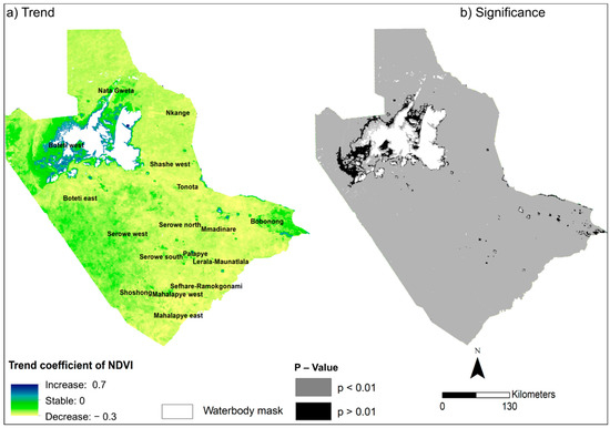 Spatial patterns of vegetation productivity change between 2000–2001 and 2020–2021 (Makgadikgadi salt pans in the north is indicated as white using the waterbody mask): (a) Vegetation trends; (b) Significance of trends.