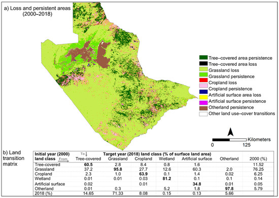 Changing land use-land cover conditions between 2000 and 2018: (a) Areas of land use-land cover loss and persistence; (b) Land use-land cover transitions from the year 2000 to 2018 in percentages (areas of persistence for each land use-land cover class are in bold, that is, areas of no change that remained in the same land class over the 18 years).