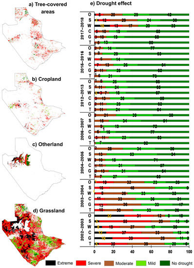 Distribution of drought severity for major land use-land cover types: (a) Tree-covered area; (b) Cropland; (c) Otherland; (d) Grassland, during the growing season of 2002–2003 (a drought year); (e) Percentage of land area under varying drought severity and non-drought conditions based on VCI for selected drought years by land use-land cover types (T = Tree-covered areas, G = Grassland, C = Cropland, W = Wetlands/Waterbodies, S = Settlement, O = Otherland).