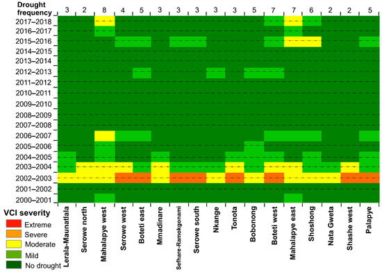 Heatmap of drought severity at constituency level during the growing seasons of 2000–2001 to 2017–2018. The years with dashed lines across were declared drought years by the Botswana government [31].