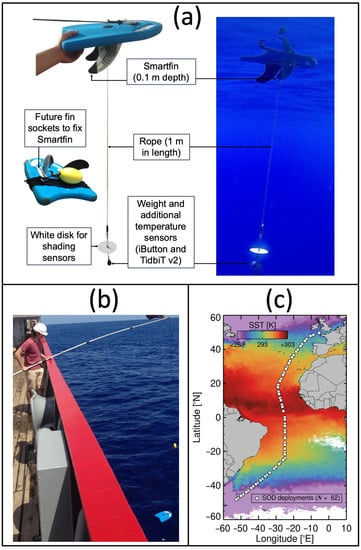 Experimental set-up and station locations. (a) The Simple Oceanographic floating Device (SOD) with Smartfin integrated, 1 m rope with iButton and TidbiT v2 sensors and white disk. Underwater image of the SOD at a station in the North Atlantic. (b) At stations where the currents were pushing the SOD into the side of the RRS James Clark Ross, a telescopic rod was used to extend the rope further away from the ship. (c) Location of SOD deployments on AMT28, overlain onto a SST4 monthly composite of October 2018 from the MODIS-Aqua satellite [37].