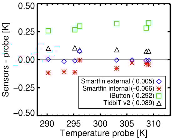 Figure 2 shows the results from the laboratory comparison of the temperature sensors (Smartfin, iButton and TidbiT v2) used on the SOD with an NPL-traceable Hart Scientific 1504 temperature bridge and Themometrics ES 225 temperature probe in a recirculating water bath [38]. The Themometrics ES 225 temperature probe is accurate to ±0.0043 K over a range of 273.15 to 323.15 K. Systematic differences between the probe and the TidbiT v2 and iButton sensors were observed ( and , respectively). Note for the iButton, Brewin et al. [40] previously reported a median (not mean as used here) difference of 0.283 K for these experiments. These differences were within the accuracies stated by the sensor manufacturers, with the TidbiT v2 sensors accurate to 0.2 K over a range of 273.15 to 323.15 K, and the iButton 0.5 K over a range of 263.15 to 333.15 K. The differences between the TidbiT v2 sensor and the Themometrics ES 225 temperature probe () were also consistent with similar laboratory tests of the TidbiT v2 sensors in other studies [27,35], for example, Brewin et al. [27] reported differences () of 0.04 to 0.15 K for five TidbiT v2 sensors. The differences between the probe and the TidbiT v2 and iButton sensors ( and , Figure 2) were relatively systematic over the temperature range tested (Figure 2), and consequently, were removed from all data collected using these sensors in subsequent analysis.