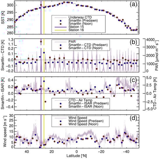 Wind speed at the 62 stations sampled varied between 0.8 and 13.8 m s (Figure 3d), though higher wind speeds were seen occasionally as the ship moved between stations. The largest differences between the Smartfin and underway CTD (Noon Station 15, ), and Smartfin and ISAR (Predawn Station 16, ), were observed at very low wind speeds (2.5 and 2.9 m s, respectively). It is well known that low wind speeds can cause large thermal gradients between skin and sub-skin SST, with SST in the thermal layer typically cooler than that in the sub-skin [18,19].