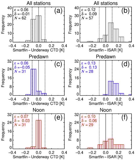 Histrograms of the differences in SST between sensors on the Atlantic Meridional Transect cruise 28. (a) Differences between the Smartfin and underway CTD. (b) Differences between the Smartfin and ISAR. (c) Differences between the Smartfin and underway CTD for predawn stations only. (d) Differences between the Smartfin and ISAR for predawn stations only. (e) Differences between the Smartfin and underway CTD for noon stations only. (f) Differences between the Smartfin and ISAR for noon stations only. Note for (a,e) one station is not shown (off the scale) where a difference between the Smartfin and underway CTD of 1.21 K was observed (see Figure 3b and Figure 5a).