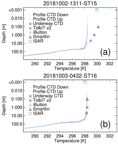 Near-surface temperature gradients determined from combining data collected on the Atlantic Meridional Transect cruise 28 from the ISAR, the Simple Oceanographic floating Device (SOD, Smartfin, iButton and TidbiT v2), underway CTD and profiling CTD. (a) Data from Station 15 and (b) data from Station 16 (titles are YearMonthDay-HourMinute–StationNumber, where Hour and Minute refer to the start time of the SOD experiment).