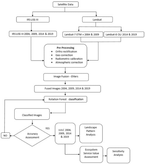 In this research, we evaluate land use changes on ES and their EV in Long County, China, from 15 years (2004–2019) using RS images. We select this area because it is an agricultural county in a poor mountainous area of the Shaanxi Province with a fragile ecological environment [29,30,31], where the growth of human population and urbanization has been exacerbating the existing scarce natural resources [29]. We aim to explore how land use changes can influence environmental policies implementation for regional sustainable development, focused on ES enhancement and protection, landscape dynamics and resource allocation in the region. To achieve this aim, we develop an integrative spatial approach with the following specific objectives: (i) to compute 15 years of LULC change dynamics in the Long County using fused imageries; (ii) to quantify the landscape patterns and characteristics of its structure and spatial configuration using landscape metrics; (iii) to assess ES value based on the ecological value estimation method; and (iv) to verify if the selected economic value is relevant and suitable for the study area using the sensitivity analysis. This paper is organized as follows. Section 2.1 and Section 2.2 describes the study area and data used in this work. Section 2.3 summarize the research design of this paper. Section 2.4 provides information about satellite data preprocessing followed. Section 2.5 describes the image fusion method. Section 2.6 provides step by step rotation forest classification algorithm to produce LULC maps. Section 2.7 explains different method followed in this project for landscape pattern evaluation. Section 2.8 explains the method used in this work to assess ecosystem services value. Section 2.9 explains the sensitivity analysis. Section 3 then combines the results from the individual stages of the research design to evaluate land use and land cover changes on ecosystem services and their economic values. Finally, Section 4 and Section 5 provide the discussion and conclusions.