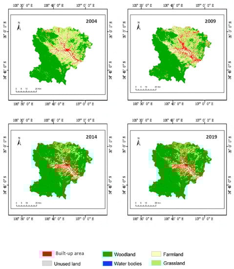 The LULC maps from 2004 to 2019 showed that farmland decreased their spatial distribution over time (−42703 hm2) (Figure 3), reaching the pick in 2019. Grassland first increased and then decreased, with an overall change of 317 hm2. Woodland also followed a similar pattern, with an overall change of 42,199 hm2, whereas the built-up area increased 1487 hm2. In general, the spatial distribution of water bodies also increased with a final gain of 906 hm2. The overall unused land decreased, and the weakening trend slowed down in 2004, with an overall change of −1717 hm2.