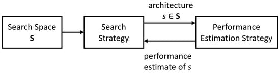 Following the exponential growth of computing power and availability of cloud computing resources in recent years, automated machine learning (AutoML) has received tremendous attention in both industry and academia. AutoML provides an attractive alternative to the manual ML practice as it promises to deliver high-performance end-to-end ML pipelines covering data preparation (cleaning and preprocessing), feature engineering (extraction, selection, and construction), model generation (selection and hyperparameter tuning), and model evaluation requiring minimal effort or intervention from the user [,,]. AutoML services have become a standard offering in many technology companies, for example Cloud ML by Google and SageMaker by Amazon. Early work by Zoph et al. [] highlighted the potential of AutoML in which a recurrent network was trained with reinforcement learning to automatically search for the best-performing architecture. Since then, research interest in AutoML has exploded, with a primary focus on neural architecture search (NAS), which seeks to construct well-performing neural architectures through the selection and combination of various basic modules from a predefined search space [,,]. NAS algorithms can be categorised based on three dimensions: the search space, the search strategy, and the performance estimation strategy [,] (Figure 1). The search space defines the type of models that can be designed, this may include simple blocks or modules stacked on each other, or more complicated structures that include skipping connections and submodules. Common NAS structure types are entire structures [,], cell-based structures [,], progressive structures [], and morphism-based structures [,]. As the search space is often exponentially large or even unbounded, a search strategy that typically consists of a hyperparameter optimisation algorithm such as Bayesian optimisation [,,], evolutionary algorithm [,], reinforcement learning [,], or gradient descent [] is used to explore the search space. Once an architecture is selected, it is evaluated using a performance estimation strategy, which speeds up performance evaluation through the use of either proxy metrics [,], extrapolation of performance via learning curve [,], or shortening of model training times by inheriting [,] or sharing weights [,,] between architectures.