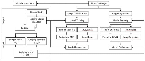 NAS-generated models have achieved SOTA performance and outperformed manually designed architectures on computer vision tasks such as image classification [], object detection [], and semantic segmentation []. However, despite AutoML showing great promise for computer vision tasks, to the best of our knowledge, no study has used AutoML for image-based plant phenotyping. To address this gap in knowledge, we examined the application of AutoML for image-based plant phenotyping using wheat lodging assessment with UAV imagery as an example. The performance of an open-source AutoML system, AutoKeras, was compared to transfer learning using pretrained CNN architectures on image classification and image regression tasks. For image classification, plot images were classified as either non-lodged or lodged; for image regression, lodged plot images were used as inputs to predict lodging scores. The merits and drawbacks of AutoML compared to transfer learning for image-based plant phenotyping are discussed. This study presents general methodology and workflows for the implementation of AutoKeras for image classification and regression applicable to the plant phenotyping task. In addition, specific methodology and workflows, including the use of a customised lodging score for UAV-based high-throughput wheat lodging assessment via AutoML and/or transfer learning are also provided.