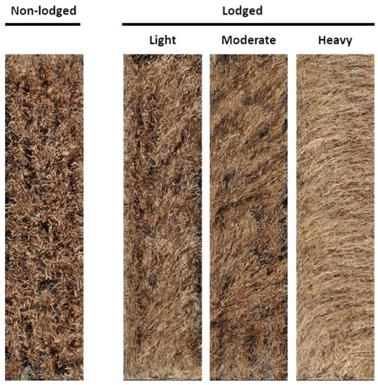A two-stage assessment of lodging was performed in this study, and the results were used as the basis for image classification and image regression tasks (see Section 2.4) (Figure 3). The image classification task corresponded to the first stage of assessment in which the lodging status, i.e., whether the plot is lodged (yes) or non-lodged (no) was provided by the ground truth data and this could be verified easily from visual inspection of the high-resolution plot images (Figure 4). The image regression task corresponded to the second stage of assessment where plots identified as lodged were evaluated using a modified lodging score based on the method of Fischer and Stapper []: