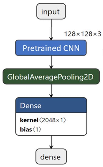 Transfer learning with pretrained convolutional neural network (CNN) architectures. Output from a pretrained CNN was joined to a global average pooling 2D layer and connected to a final dense layer, with the activation function set as either “sigmoid” for image classification or “linear” for image regression.